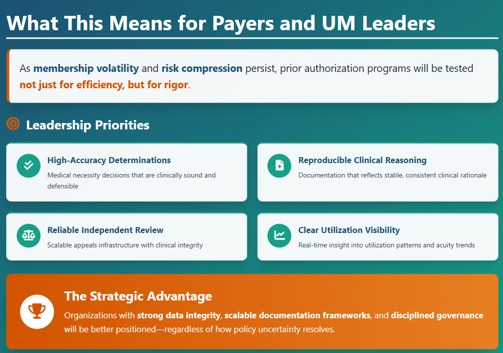 For executives, the opportunity is to treat these developments not simply as compliance obligations, but as early indicators of where utilization management is headed. Investments made now in documentation quality, clinical alignment, and review infrastructure will shape how confidently organizations navigate 2026.