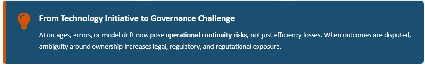 Together, these dynamics reframed AI from a technology initiative into a governance challenge. AI outages, errors, or model drift now pose operational continuity risks, not just efficiency losses. When outcomes are disputed, ambiguity around ownership increases legal, regulatory, and reputational exposure.