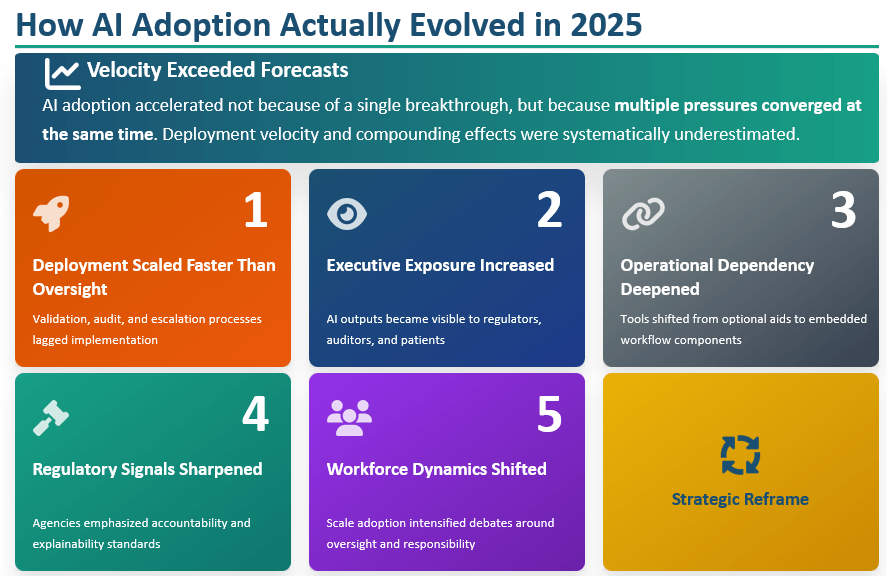 This article explores how AI adoption actually unfolded in 2025, why governance emerged as the central challenge, and what the signals from this shift suggest for healthcare executives preparing for 2026.