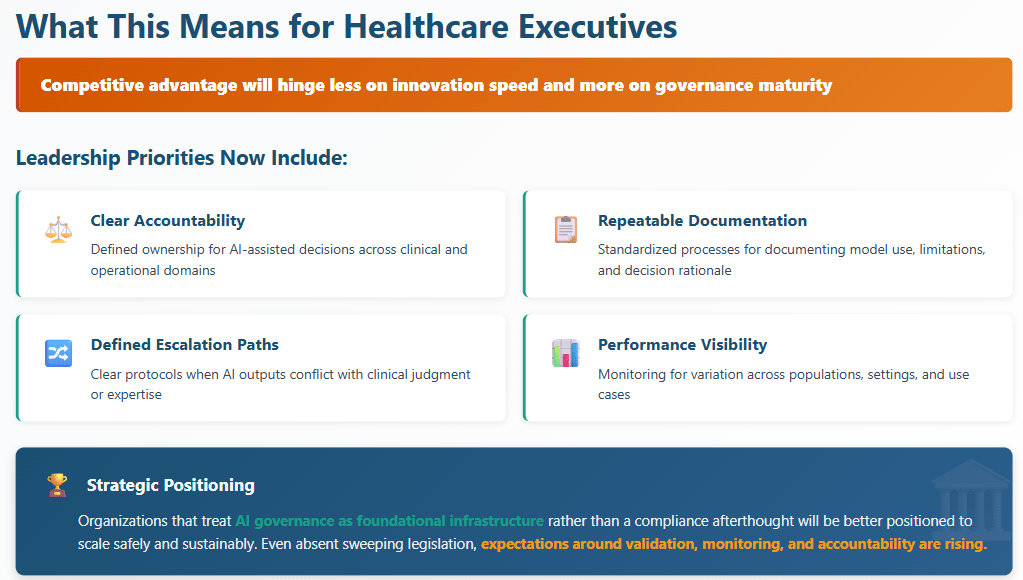 In 2026, healthcare executives should focus on governance maturity rather than adoption volume. Priorities include defining accountability for AI-assisted decisions, documenting how AI tools are used and limited, establishing human-in-the-loop oversight, and ensuring consistency across populations, workflows, and oversight bodies.