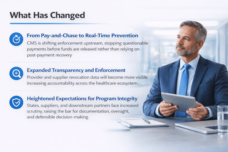 Expanded Transparency: CMS will publish information on revoked Medicare providers and suppliers, including NPIs and revocation rationale, increasing visibility for payers and other stakeholders.