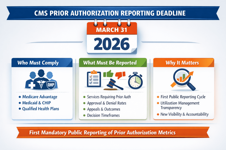 A major prior authorization transparency deadline is now here for impacted health plans. Under CMS’s Interoperability and Prior Authorization Final Rule, impacted payers must publicly report certain prior authorization metrics for calendar year 2025 on their public-facing websites by March 31, 2026.